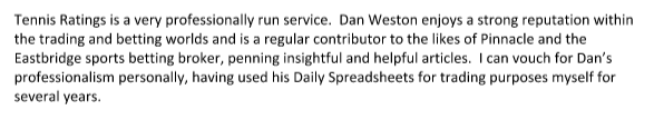 “I’ve used the TennisRatings Spreadsheets in the Tennis Markets over time and can’t rate them highly enough!”