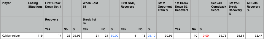 An example of this is Phillip Kohlschreiber, who for the matches that I can get point by point data for, has yet to recover a break deficit in the third set since I started collecting data at 1st July, 2014, despite the fact that his recovery data in other sets is slightly above average. Certainly, backing the ageing German when losing in the final set of a best of three set match does not seem to be a viable proposition, as a screen shot of his recovery data from the lead loss/recovery spreadsheets illustrates:-